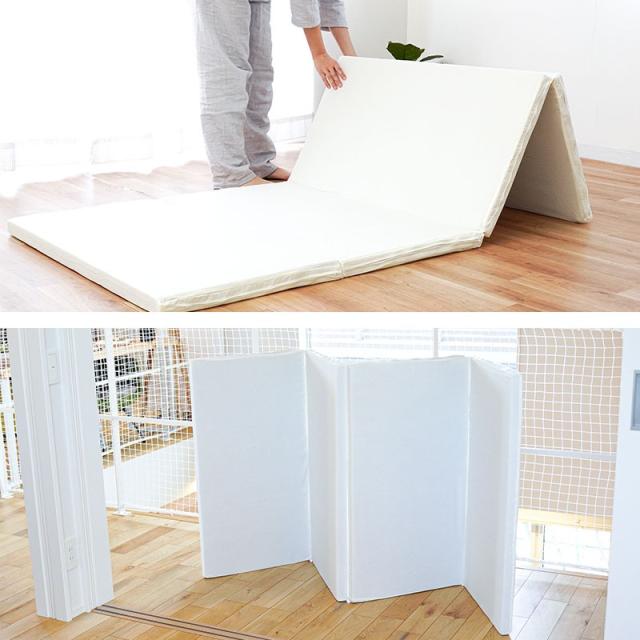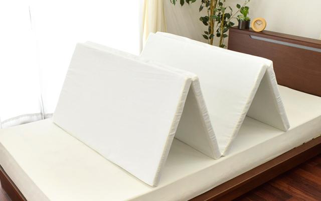 マットレスを敷きっぱなしにしていると、湿気がこもって傷みやカビの原因に。長くお使いいただくために、たまに風通しをしてあげてください。四つ折りタイプなので、画像のように立て干しが可能です。