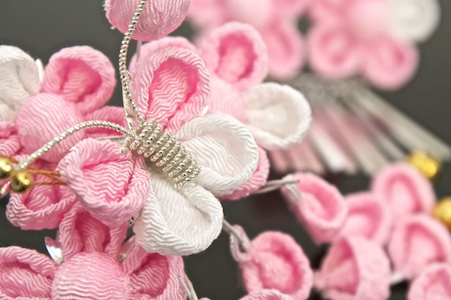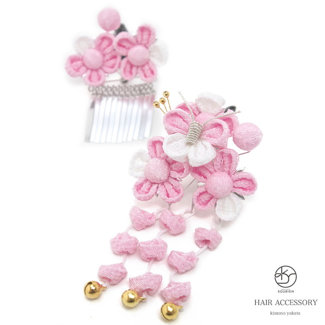 ぷっくりとした質感の縮緬素材のお花と、同素材の蝶のモチーフが可愛らしい髪飾りです。