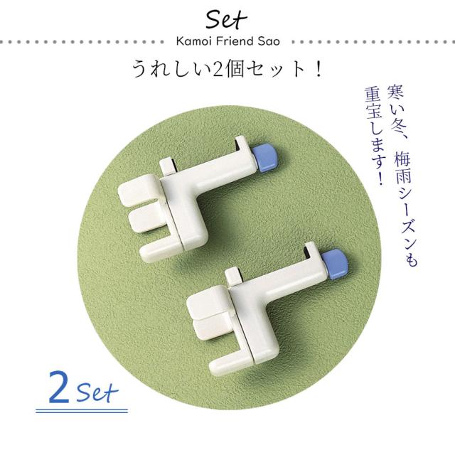左の写真のようにセットし、ご自宅の洗濯物の干し竿をしっかり固定できる「かもいフレンド竿用」です。キズをつけずに固定できるので、賃貸住宅など特に気になる場合でも安心です。雨の日だけでなく、寒い冬、梅雨シーズンの洗濯物の家干しにたいへん重宝します。※2個セットでお届けします。「関連ワード」雑貨屋さん 日用品 日用雑貨 アイデア 便利グッズ おしゃれ 通販