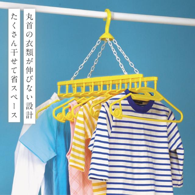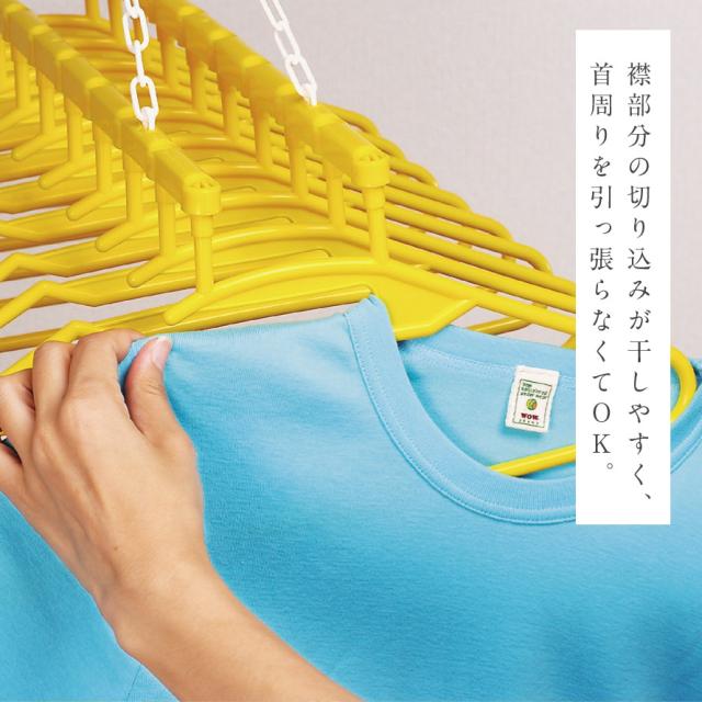 お洗濯干しの悩みを解決してくれる工夫がいっぱい!幸せの黄色いハンガー10連式。丸首の衣類の首周りをのばさず干せる設計。襟部分の切り込みが干しやすく、首周りの引っ張ってかける必要がありません。首周りが小さい子供服やタートルネックも干しやすい仕様です。