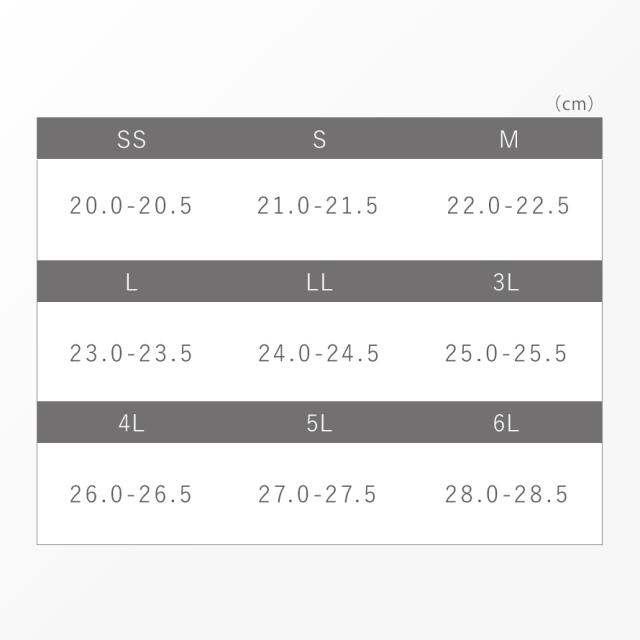 ■サイズ (3E/足囲):SS/20.0-20.5(21.7)、S/21.0-21.5(22.4)、M/22-22.5(23.1)、L/23-23.5(23.8)、LL/24-24.5(24.5)、3L/25-25.5(25.2)、4L/26-26.5(25.9)、5L/27-27.5(26.6)、6L/28-28.5(27.3)cm