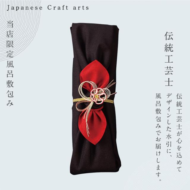 風呂敷ラッピングには、水引きの伝統工芸士の方にデザインしていただいた素敵な水引きが添えられ、さらに特別なギフトとしての豪華さが増します。