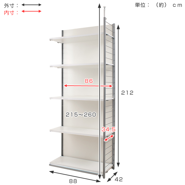 | サイズ | 外寸:約 幅88×奥行42×高さ215〜260(cm) 収納部内寸:約 幅86×奥行34.5×高さ8(cm) |