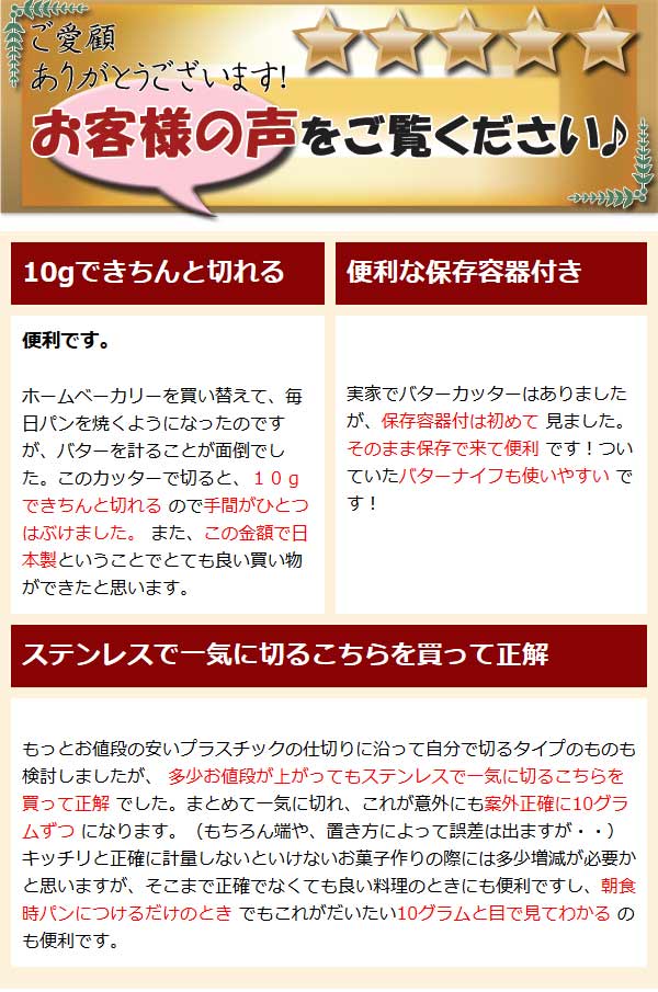 | 備考 | ※バターが硬いとカッターが変形する恐れがあるので、常温に戻したバターをカットして下さい |