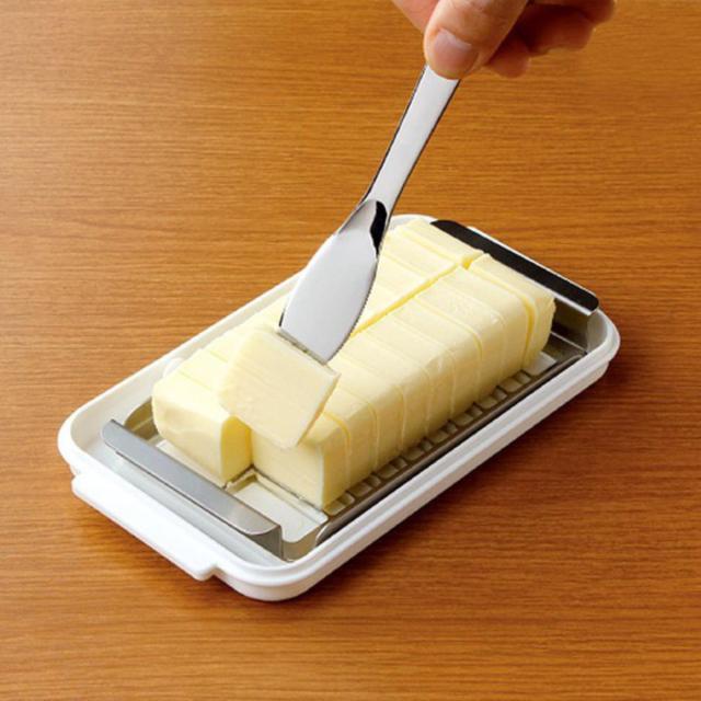 バターを押すだけでカットすることができて、そのまま保存できるバターケースです。市販のバター200gを1ブロックあたり約10gに、1度で20個にカットすることができます。お菓子作りやパン作りの分量の目安にぴったりです。