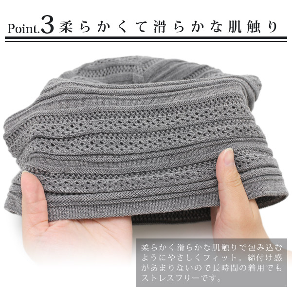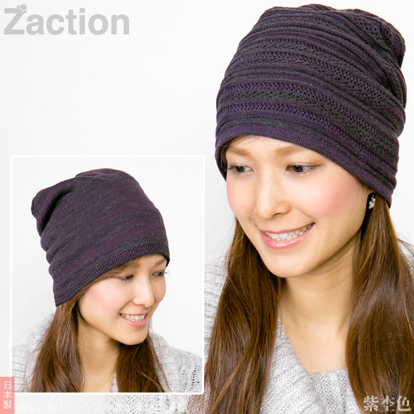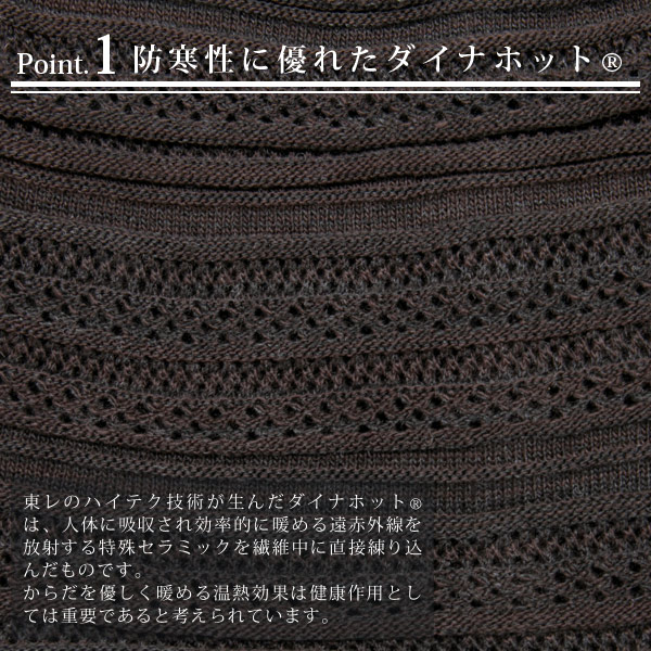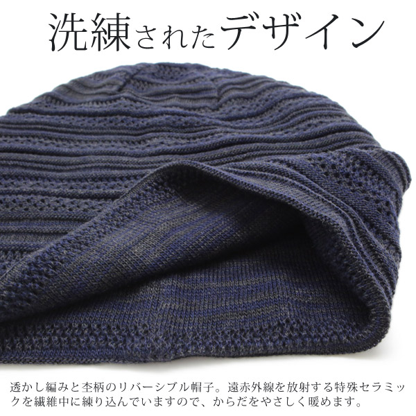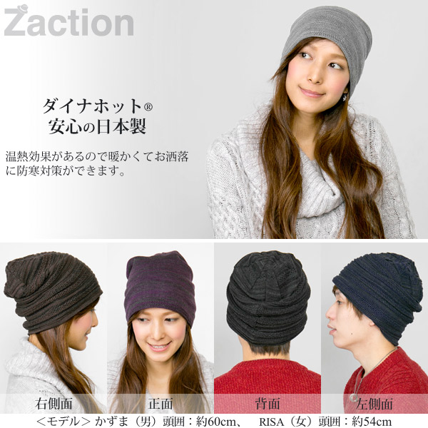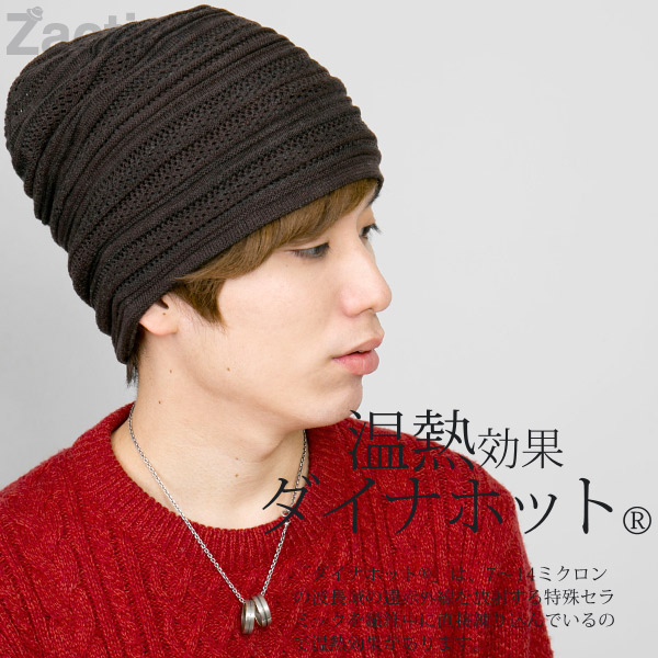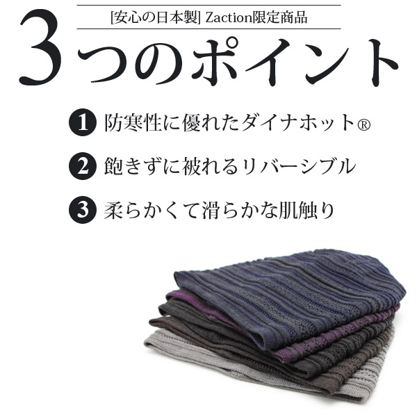 やさしい温熱効果で、効率的に暖める東レの『ダイナホット®』を使用したZactionオリジナルのニット帽です。遠赤外線を放射する生地の特性により、ふんわりとした保温性があって防寒の役割を果たしてくれるます。製造も日本製でデザインにもこだわり、透かし編みと杢柄のリバーシブルタイプの帽子。表面の透かし編みは、ファッション性も高く男女とも程よく似合うデザインであり、裏面の杢柄は、2色の糸を使用することでシンプルながら絶妙なバランスの配色に仕上がりました。柔らかくなめらかな肌触りで包むようなフィット感を実感していただけるのではないでしょうか。