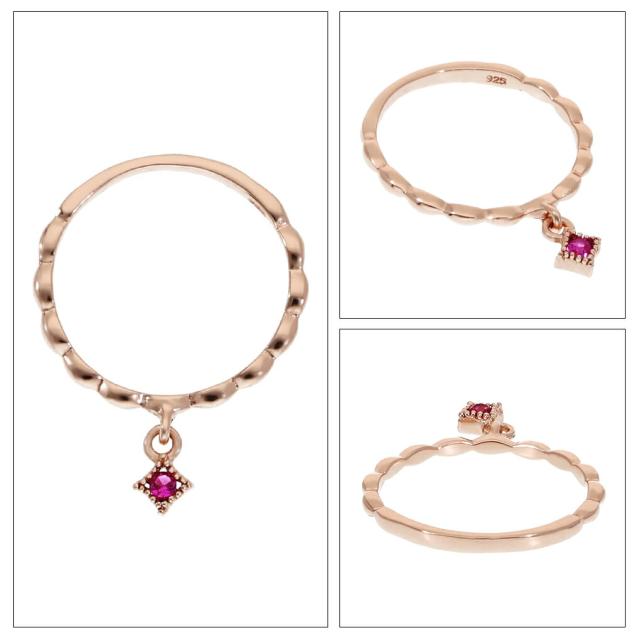 さりげない小さなダイヤ型チャームが優雅に揺れる、ピンクゴールドカラーの細身なリング。