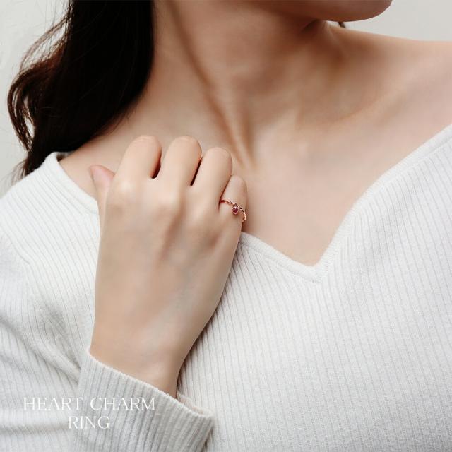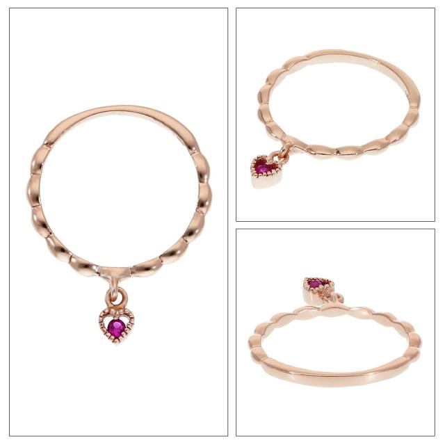 さりげない小さなハート型チャームが優雅に揺れる、ピンクゴールドカラーの細身なリング。
