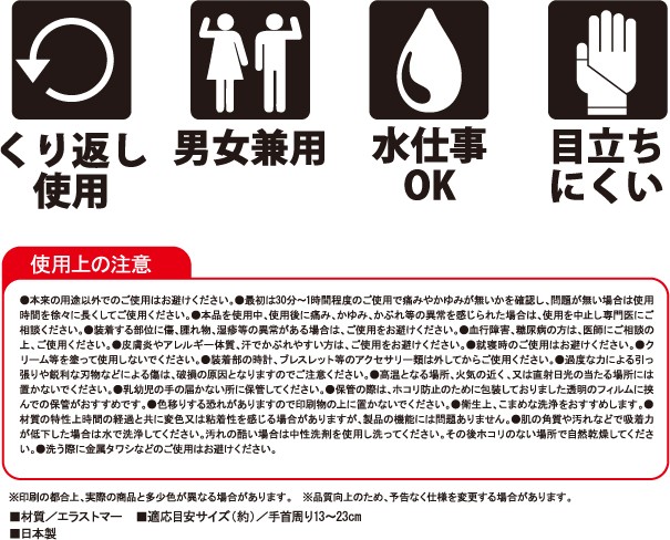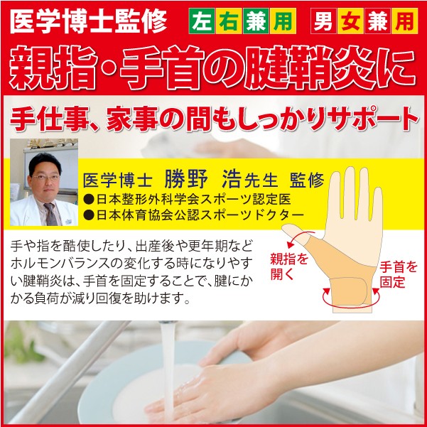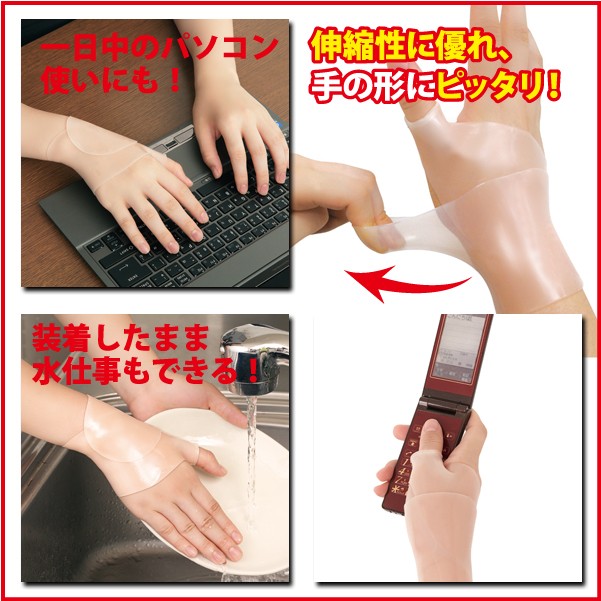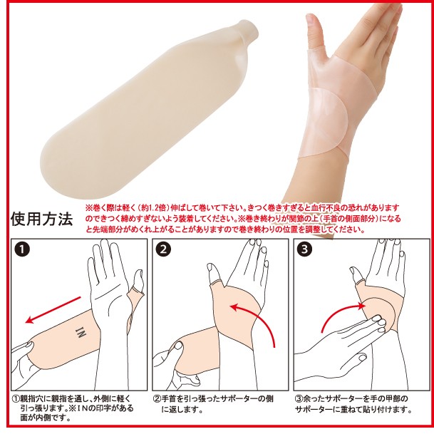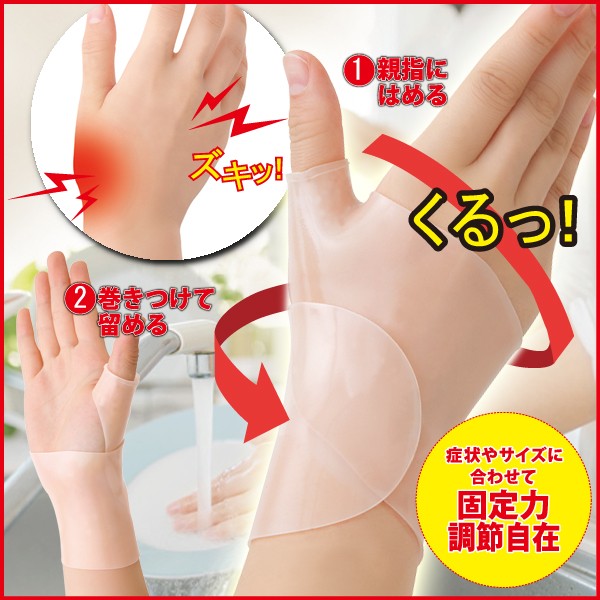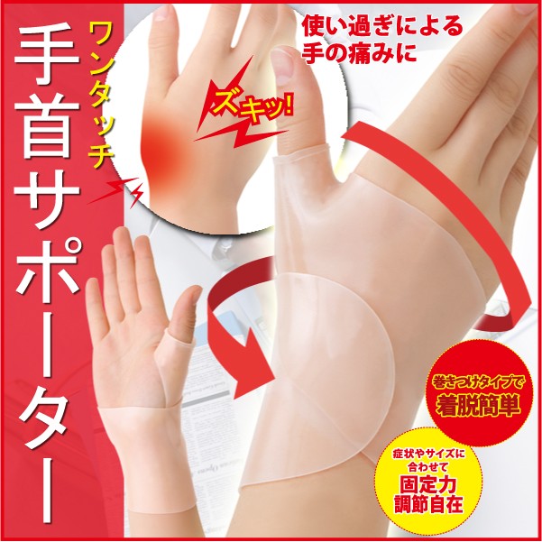 医学博士監修手首サポーター!親指・手首が痛い方にお勧め手首用サポーターです。薄手のゲル素材により簡単装着で水仕事OK!のワンタッチ手首サポーターでカラーは目立ちにくいクリアベージュです。伸縮性にすぐれているので手の形状にピッタリフィットする勝野先生監修の勝野式手首サポーターです。固定力調節自由自在、左右兼用、男女兼用。[カラー]ベージュ[材質]エラストマー[サイズ]適応目安サイズ(約)手首周り13〜23cm[原産国]日本【注意事項】お届け方法は送付先のポストへ投函される「メール便」の為、支払い方法で商品代引きは不可になります。日時指定は出来ません。
