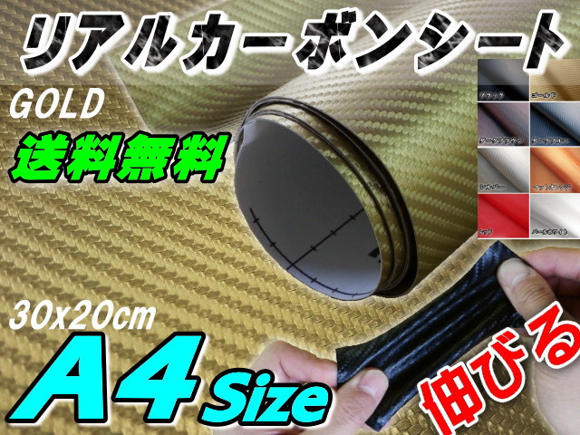カーボン (A4) 金 【メール便 送料無料】 幅30cm×20cm リアルカーボンシート 糊付き ゴールド カーボン調シート 耐熱 伸びる 3D 曲面対応 カッティング可能シート状 内装 外装 ボンネット リアルドライカーボン 施工 屋外 フィルム 【RCP】