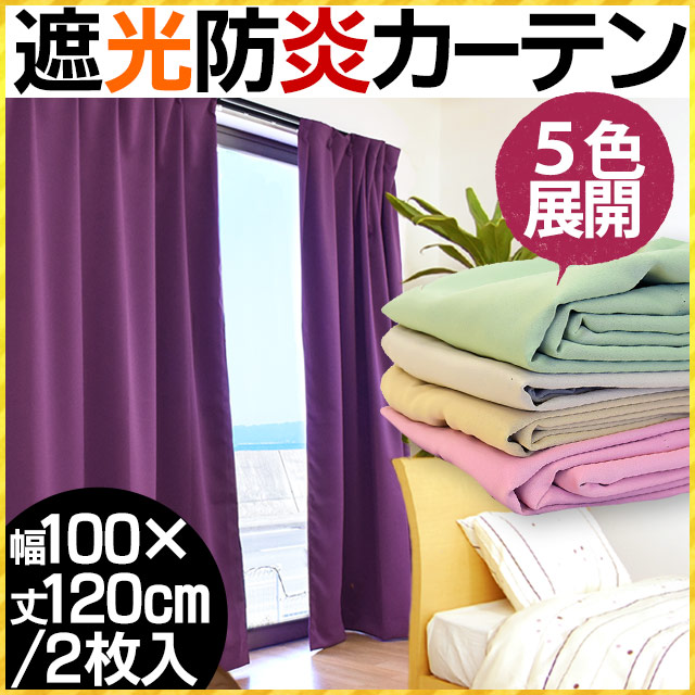 【代引き不可】【後払い不可】日本製 1級遮光 防炎 カーテン 幅100×丈120cm 2枚組 (ベージュ/グリーン/アイボリー/ピンク/パープル)