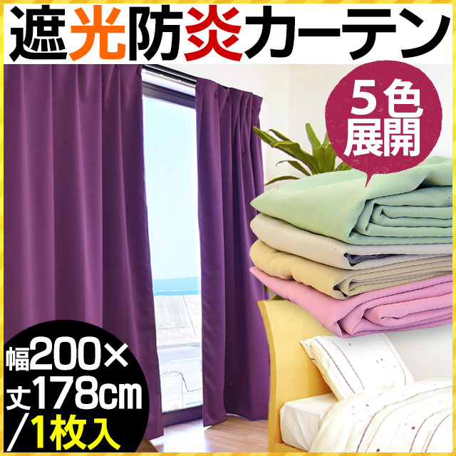 【後払い不可】日本製 1級遮光 防炎 カーテン 幅200×丈178cm 1枚単品 (ベージュ/グリーン/アイボリー/ピンク/パープル)