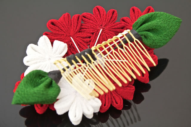 贅沢に正絹素材を使用したつまみ細工付のコーム式髪飾り。