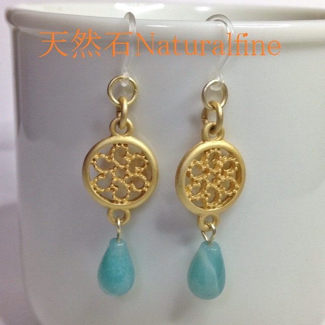 こちらは、マットゴールドのデザインメタルにしずくのアマゾナイトをつけました!