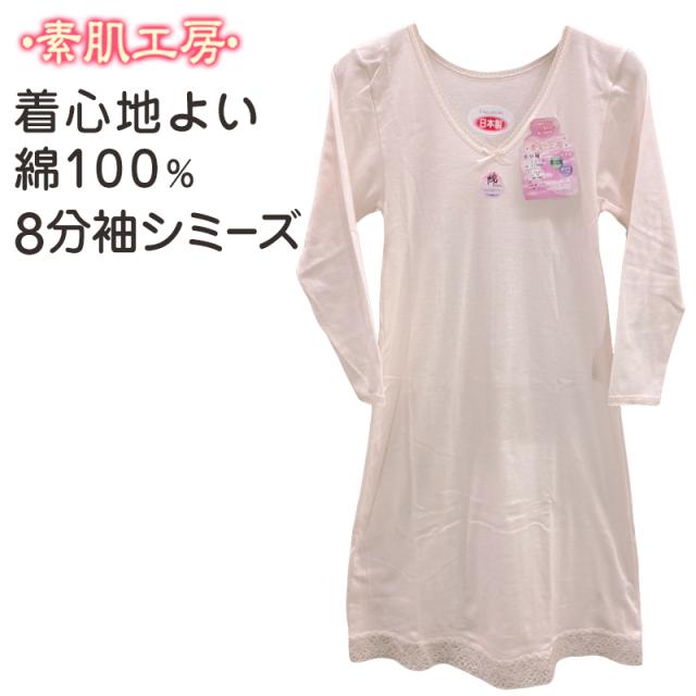 スリップ 長袖 綿100% 8分袖 シミーズ シュミーズ M〜LL インナー ワンピース ロング ひざ丈 ランジェリー 下着 肌着 レディース 透け防止 日本製