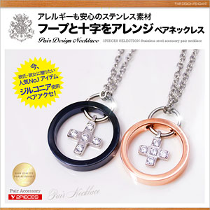 フープ(輪)をアレンジしたステンレス製ペアネックレスです。メンズはブラック、レディースはピンクゴールドコーティングしたフープの中にCZ使いをした十字架が揺れるデザインです。アクセサリーにおける『輪』は永遠を意味し、ペアアクセサリーにもピッタリのデザインです。【ペアネックレス/ペアペンダント】■サイズ┗【LADY 】:長さ:2.3cm(バチカン含む) 幅:1.8cm 厚み:0.3cm 重さ:2.8g┗【MEN】:長さ:2.4cm(バチカン含む) 幅:1.9cm 厚み:0.3cm 重さ3.2g■45cm/50cmステンレスチェーン付き■素材:ステンレス/CZ(ジルコニア)≪c-code≫ ブラック/ピンクゴールド
