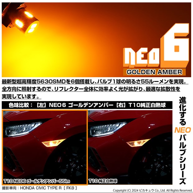 LED,ピカキュウ,LEDバルブ専門店,SMD,T10,T10 HYPER NEO 6ウェッジシングル球,ゴールデンアンバー,アンバー色,オレンジ色,ウインカー
