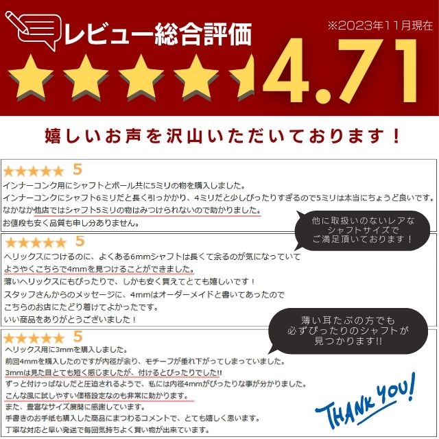- ヘリックスのシャフトが10mmだと長く、8mmだと短くて間の9mmがあって助かりました。 奇数の長さの取り扱いは本当ありがたいです。 しかもセミオーダーでこのお値段。 いつもありがとうございます。