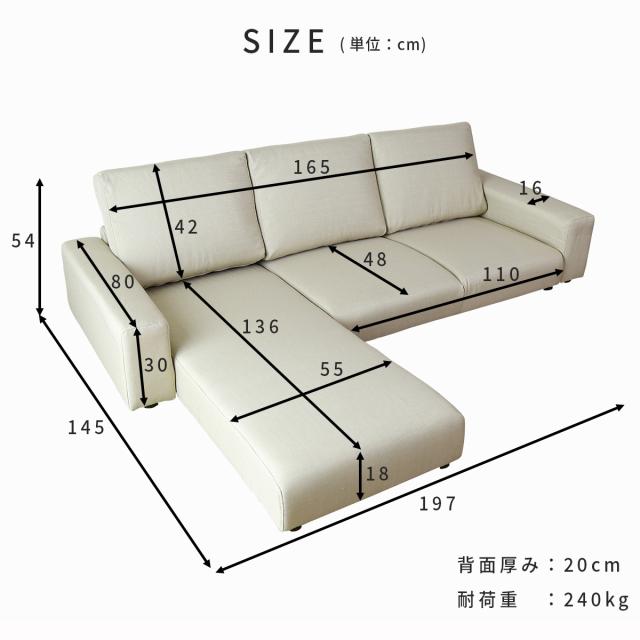◆サイズ:ソファ本体/約:幅197×奥行80〜145×高さ56 座面高20(cm)