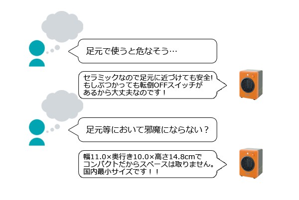 「温風による循環暖房効果、国内最小。」 ■コンパクト、お一人に一台 ■セラミックなので足元に近づけても安全 ■転倒OFFスイッチ | ||||||