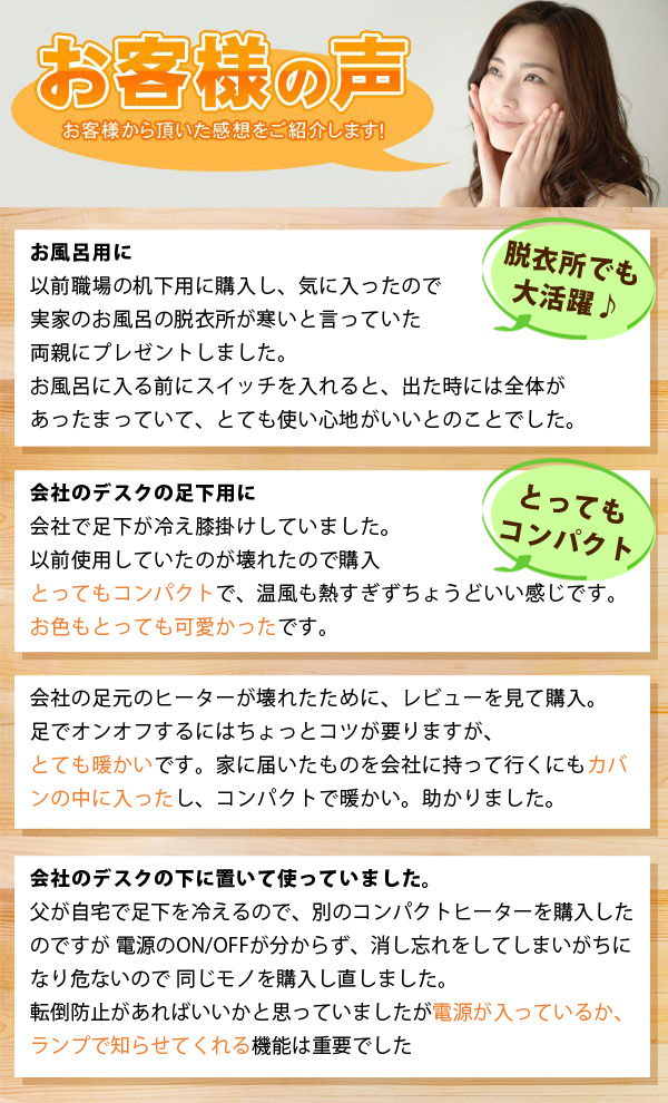 - 職場で検品の作業で座りっぱなしなのですが、寒さを感じる季節になり足下の寒さを感じ小型ヒーターを購入しました。 小型で足下でも邪魔にならず、ファンが回っているので毎日快適に作業ています。購入して良かったです。