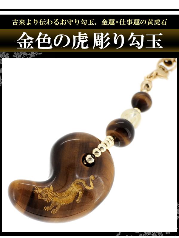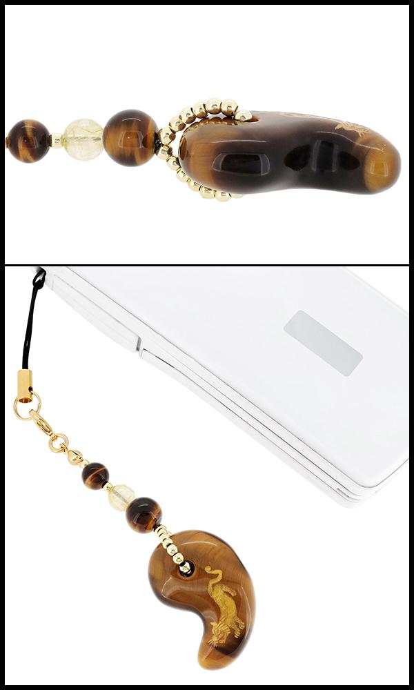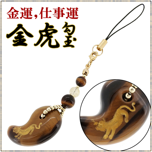 金虎を彫り込んだタイガーアイの勾玉をメインに、豪華なゴールドカラーに仕上げた携帯ストラップです。