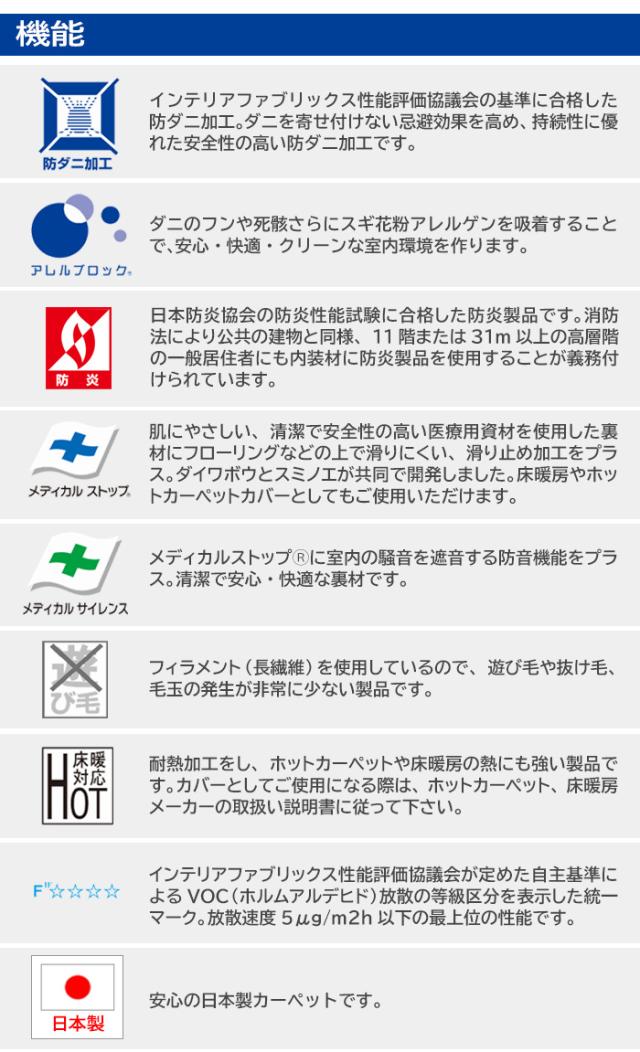 遊び毛防止機能、滑り止め、床暖対応、ホルムアルデヒドをほぼ放出しない