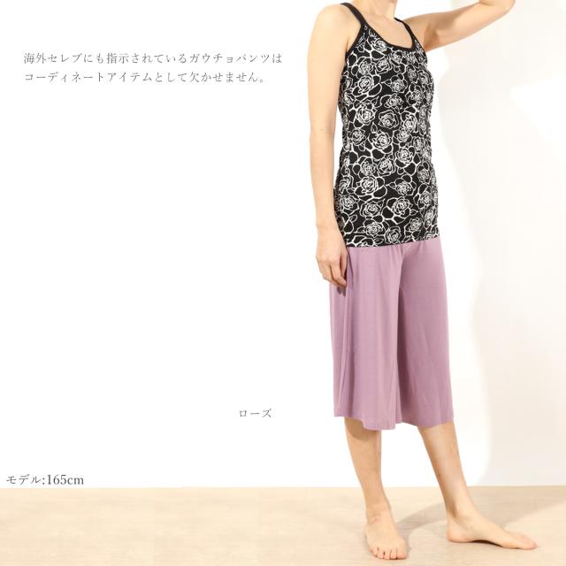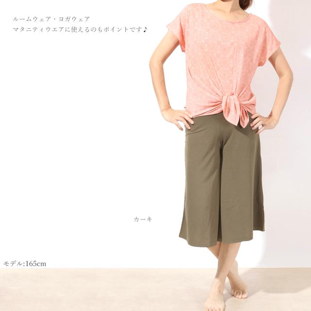 旬のコーデに☆ガウチョパンツ登場☆履くだけで、ワンランク上のヨガスタイルが決まる!二重仕立てのウエストと裾の広がりがオシャレ♪ ルームウェア・ヨガウェア・マタニティウェアに使えるのもポイント♪ 海外セレブにも支持されているガウチョパンツはファッションアイテムとしても欠かせません☆ 肌触りの良いレーヨンストレッチ素材を使用しているので履き心地バツグンです☆