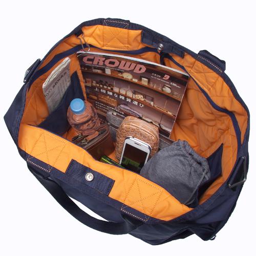 | シンプルな見た目に反した内側の鮮やかなオレンジカラーは、ミリタリージャケットのライニングをイメージ。更に、軽さ・柔らかさは正に一級品! サイドのマチ付きポケットは、ペットボトルや折り畳み傘が収まる程ゆとりのある設計!また、持ち手も長めに作られているのでトートバッグ時の肩掛けも可能です。少し大きめのB4サイズ対応なのでファイル等も楽々収納可能。 内側の取り外し可能なポケットは、持ち手付きの便利なポーチとしてもお使い頂けます。 |