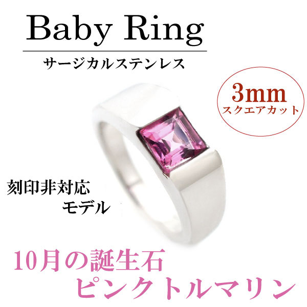 ベビーリング 送料無料 刻印非対応 ステンレス 10月ピンクトルマリン スクエアモデル サージカルステンレス