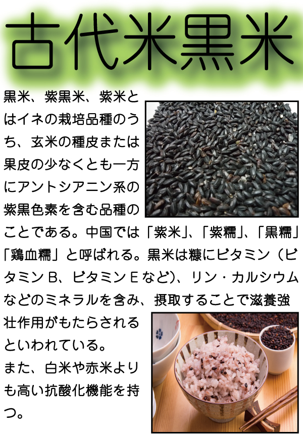 黒米は糠にビタミン(ビタミンB、ビタミンEなど)、リン・カルシウムなどのミネラルを含む。