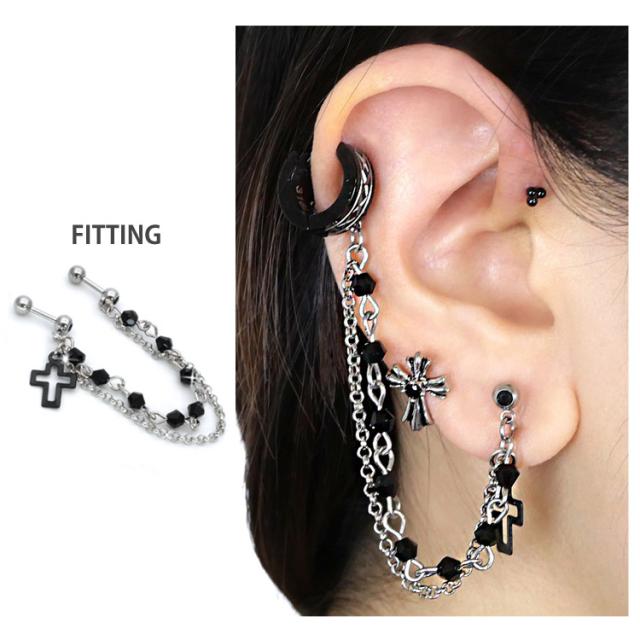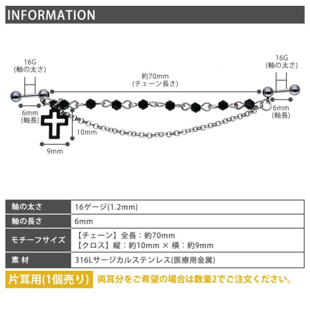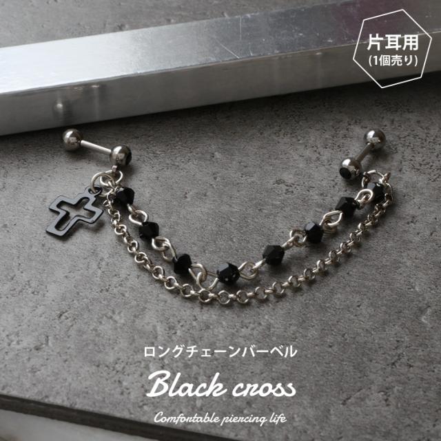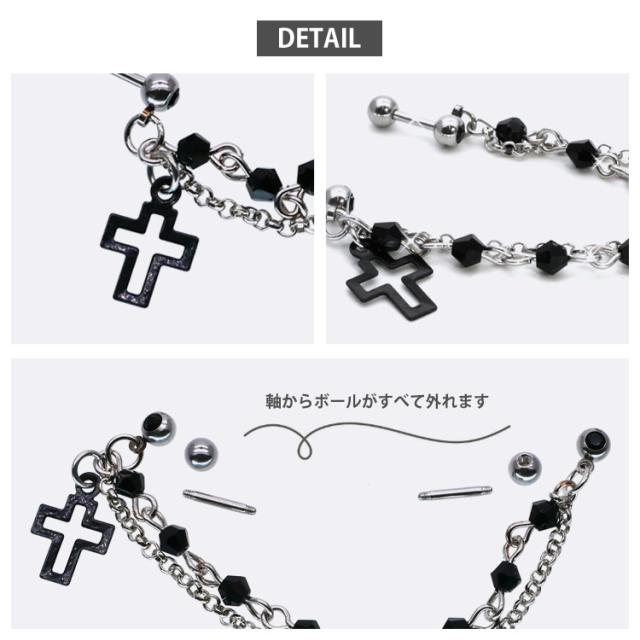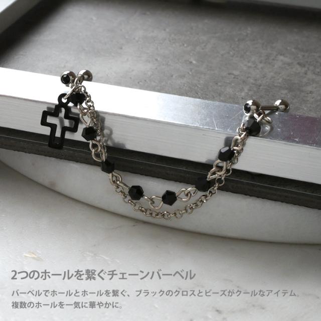 1,000円ポッキリSALE ピアス 軟骨 ボディピアス 2つのホールを繋げる ロングチェーンバーベル ブラッククロス 16G
