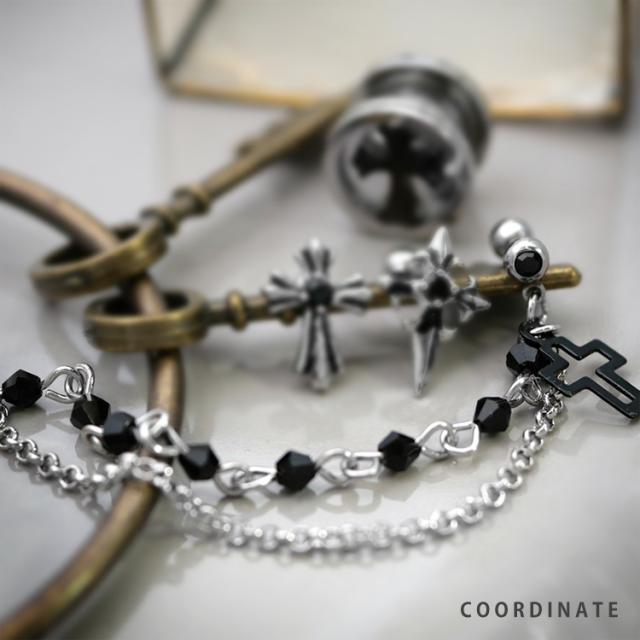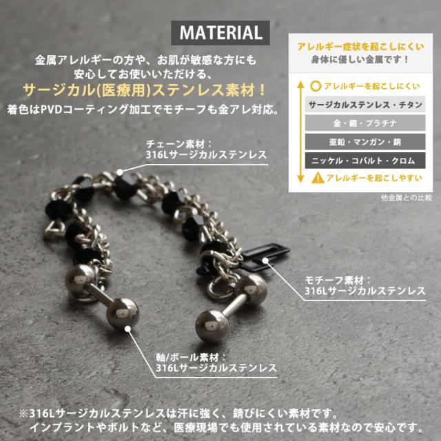 2本のショートバーベルがクロスチャーム付きの長めのチェーンでつながった、とってもお得なボディジュエリー。 複数ホールを個性的に飾ることができるアイテムです。 ブラックカラーのジュエル&チャームがクールに決まりますよ。 耳たぶピアス以外にも、軟骨ピアスや少し離れたホール同士をつなげるコーディネートもオススメ。 バーベルの太さはボディピアスのスタンダードサイズの16G。 材質はアレルギーが起きにくいサージカル(医療用)ステンレス素材なので安心です。