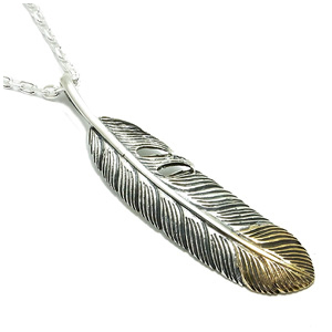シルバーとブラス、2つの輝きを持つフェザーモチーフのペンダントトップです!大柄、そして繊細に作られたアイテムで、その風格はどことなくエスニックな雰囲気に包まれています!