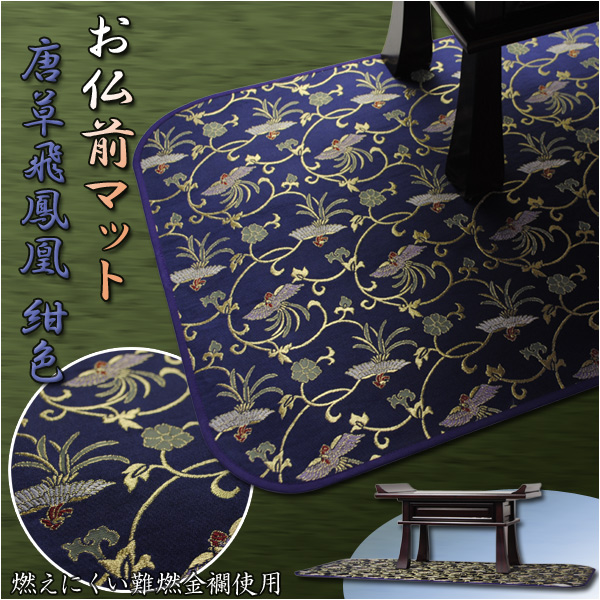 仏壇・経机用【お仏前マット:唐草飛鳳凰・紺色】燃えにくい防燃加工 送料無料