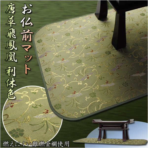 仏壇・経机用【お仏前マット:唐草飛鳳凰・利休色】燃えにくい防燃加工 送料無料