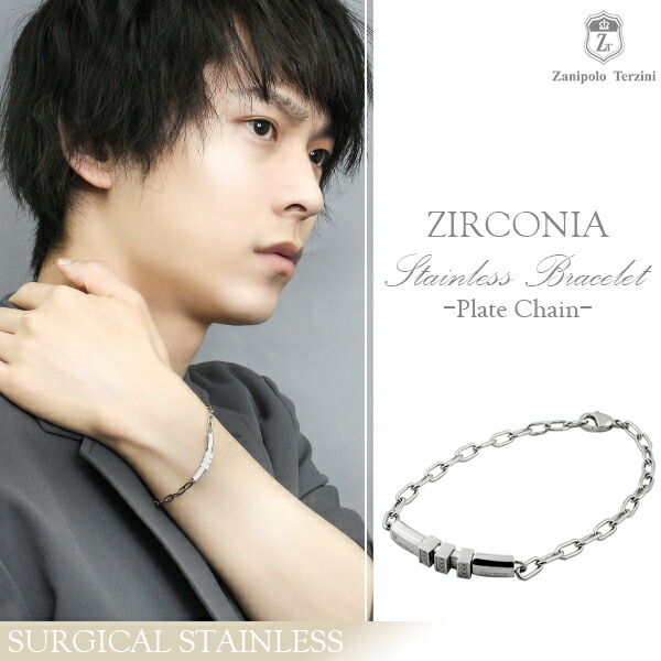 【Zanipolo Terzini/ザニポロタルツィーニ】キュービックジルコニア連マスパーツ プレート&チェーン サージカルステンレスブレスレット