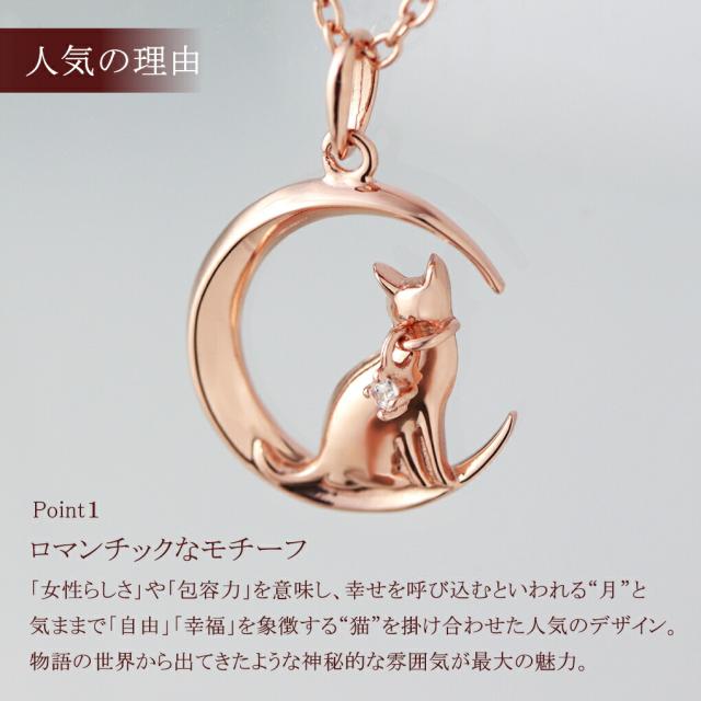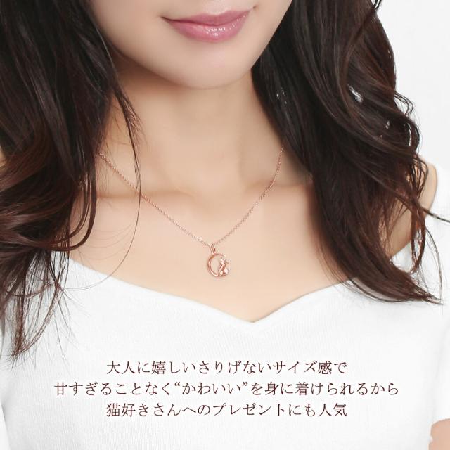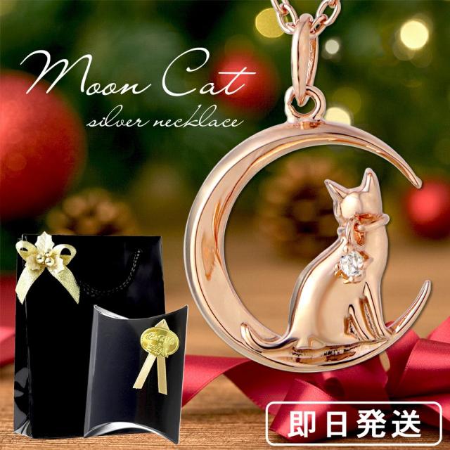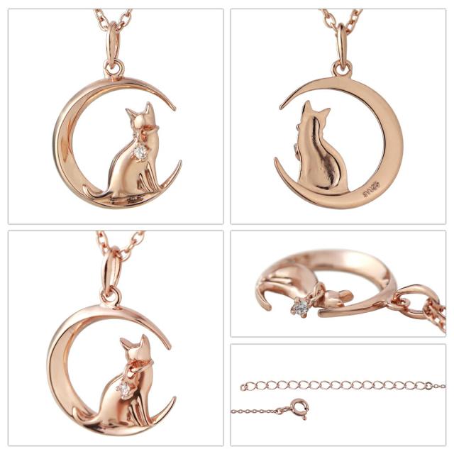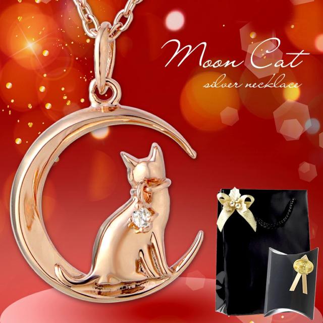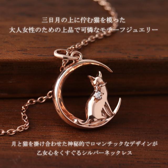 三日月 に佇む 猫 ピンクゴールド ネックレス ペンダント レディースネックレス シルバー 925 ジルコニア ネコ 猫ネックレス 猫グッズ 猫好き
