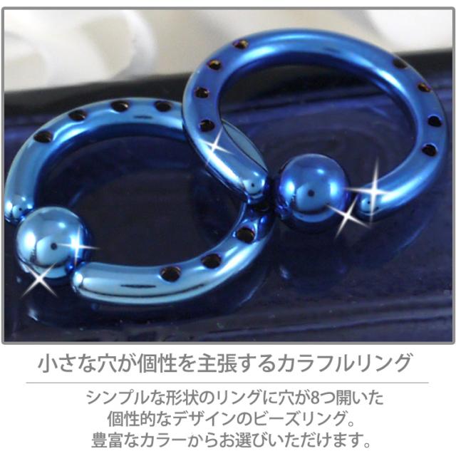 リングに小さな穴が沢山あいたビーズリング。シンプルなデザインが使い勝手抜群のアイテムです。 カラーはピンクやレッドなど珍しいカラーも含めて何と7種類もあるので、あなた好みのカラーが見つかるはずです。 ヘリックスなどの耳の軟骨ピアスにも着用OK!アレルギーの起こりにくいサージカル(医療用)素材製で安心です。