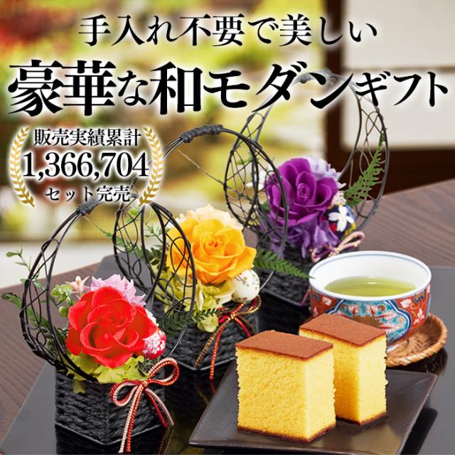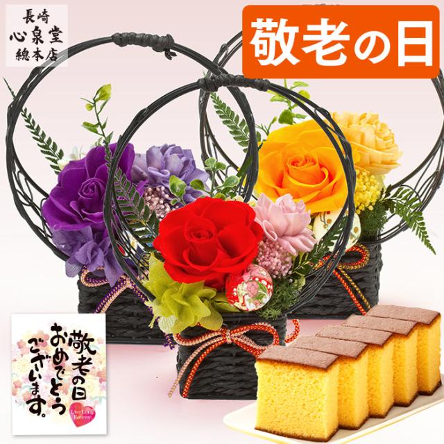 敬老の日 花 [ 花とスイーツ ギフト おばあちゃん プレゼント プリザーブドフラワー 和菓子 ] 選べるお花と スイーツ セット KRD8 お菓子 ブリザード 枯れない 人気 アレンジ 花かご 編みかご お花 おしゃれ 食べ物 カステラ