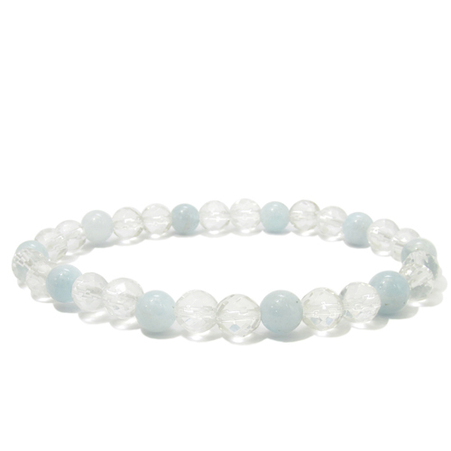 綺麗な6mm玉のアクアマリンとカット水晶を組み合わせた細身のブレスレットです。キラキラとした輝きと淡い水色がさりげなく魅せる、他のブレスとの重ね着けもしやすいシンプルなアクセサリー♪
