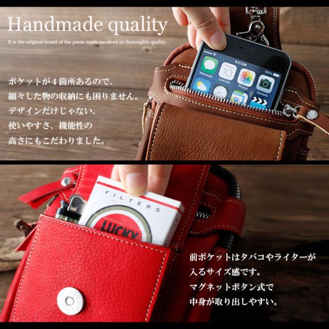 キメが細かくとても柔らかくて肌触りのいい上質のカーフスキン(子牛の革)を使用し、革職人がハンドメイドで製作しています。ベルトループはボタン式になっているため簡単に付け外しができます。長財布もすっぽり収納可能な丁度いい大きさで、小物類も分けて収納可能です。前面ポケットにはiPhoneはもちろんandroidなどの少し大きめなスマートフォン収納に対応!ストッパーがあるのでバイカーにもオススメです。本革ですので使い込むほどに革がなじみ、風合いが増していきます。