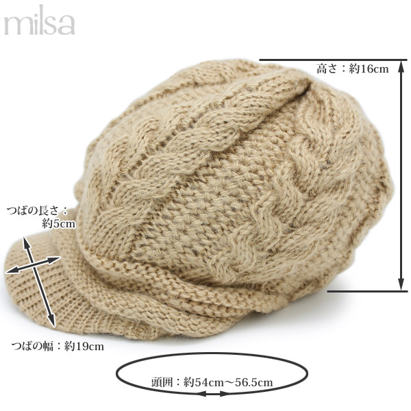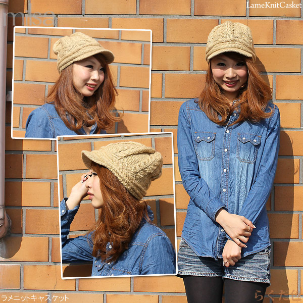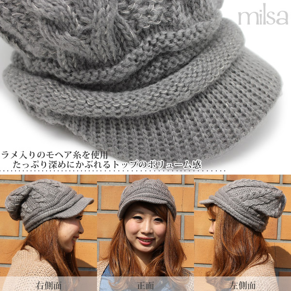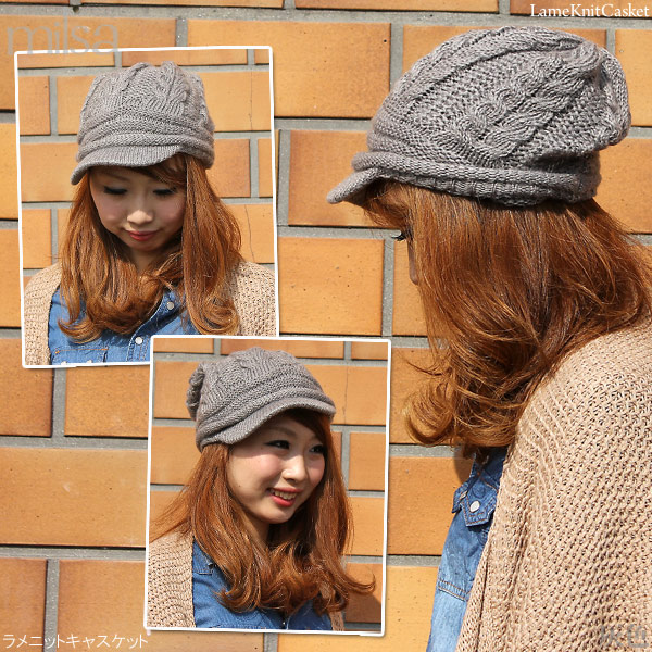たっぷりボディのゆったり深めに被れるニットキャスケットです。しっかり詰まった縄編みが綺麗で、被り口上段はロールアップの切替と凝ったデザイン。この形は服装も年齢も選ばないという利点がありますので、多くの方にオススメできます。つばの角度を正面、やや斜めなどに傾けるだけでも違った雰囲気で着用可能ですよ。ラメ糸のさりげないキラキラ感が魅力ですね。