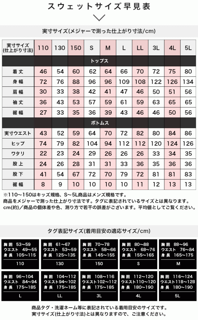 ※110〜150はキッズ、S〜5L商品はメンズ規格