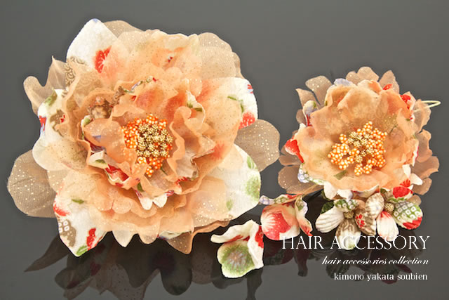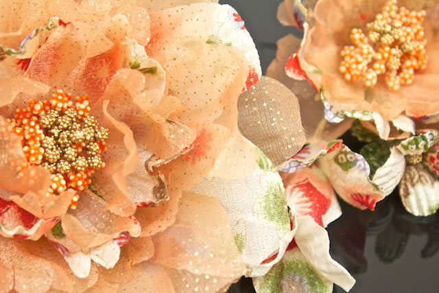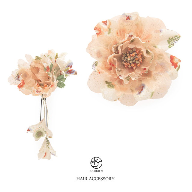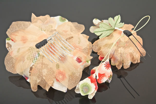 透け感のある素材と和柄の花びらを重ね可愛らしい髪飾りに仕上げました。