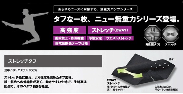 超軽量&ウルトラストレッチ&高機能のパンツ。4WAYストレッチ素材で介護、運送、メンテ作業まで、幅広く活躍。