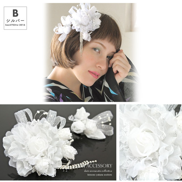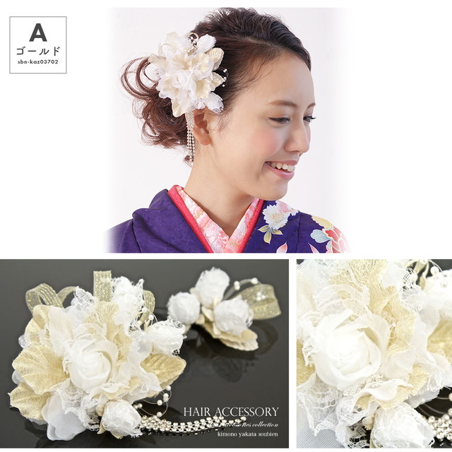 髪飾り 成人式 2点セット 卒業式 振袖 花 フラワー 薔薇 パールビーズ チュールリボン ラインストーン ドレス パーティー 髪留め ヘアアクセサリー 和装