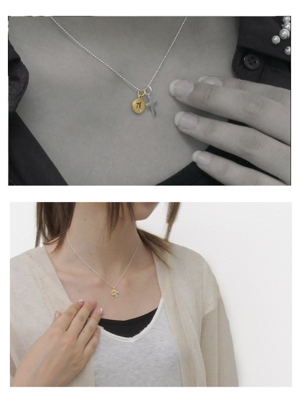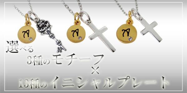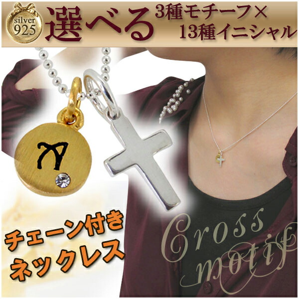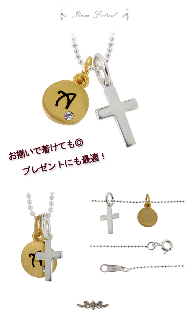 小さめデザインのクロスとアルファベットが一つ刻まれたプレートがコンビになったシルバーネックレスです。