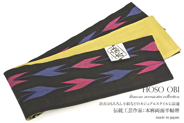 浴衣 帯 半幅帯 リバーシブル 小紋 夏着物 黒 黄色 おび工房 矢羽根 伝統工芸士 本麻 半巾帯 細帯 送料無料