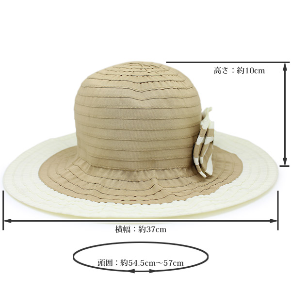 | サイズ | サイズ表記57.5cm(頭囲:約54.5〜57cm、高さ:約10cm、横幅:約37cm[つばも含む]、つばの長さ:約10.5cm) |